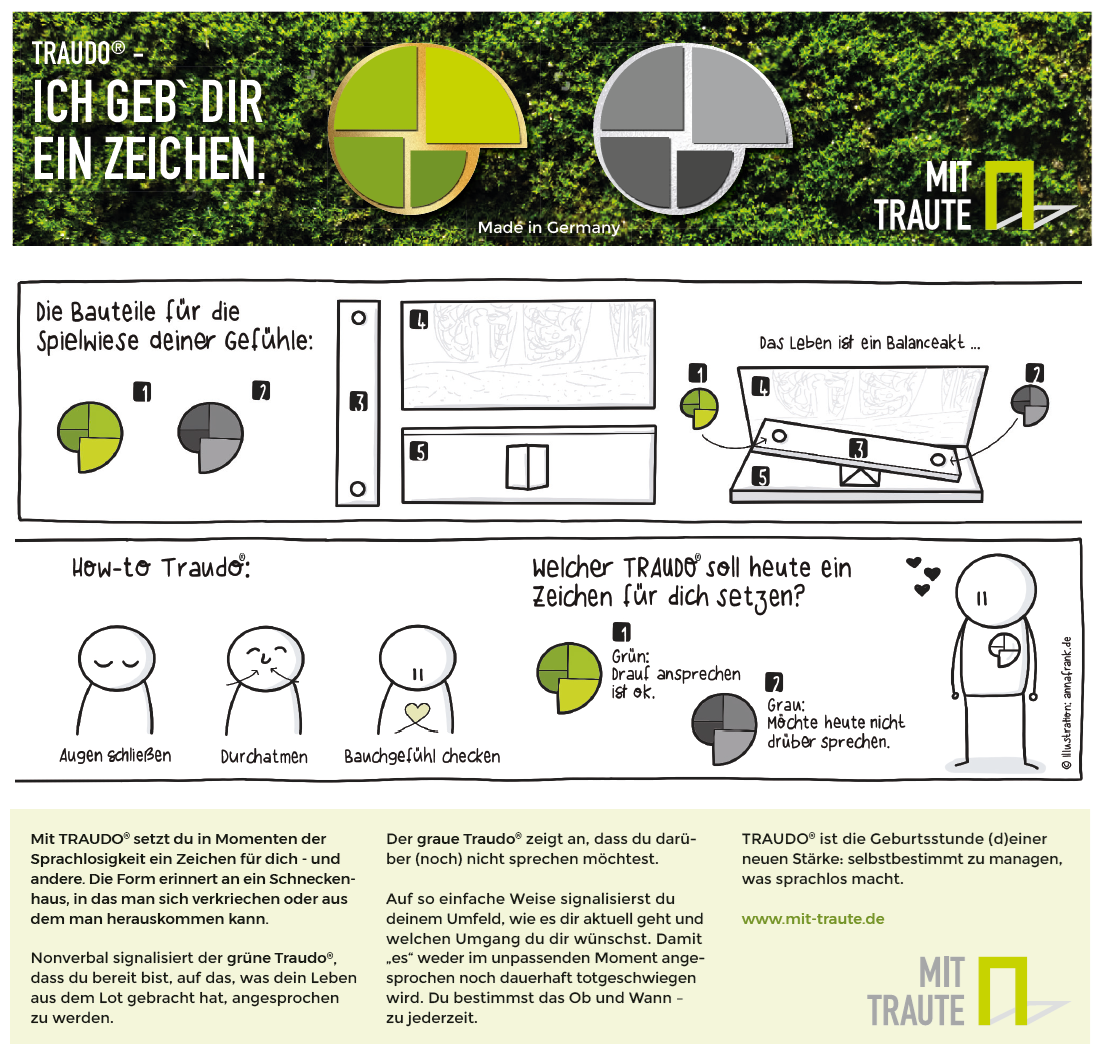 - TRAUDO® in grün signalisiert, dass mitfühlende Menschen ihr rücksichtsvolles Schweigen brechen und die betroffene Person offen auf das Geschehene ansprechen dürfen.